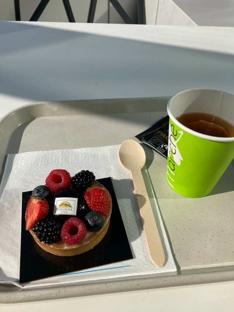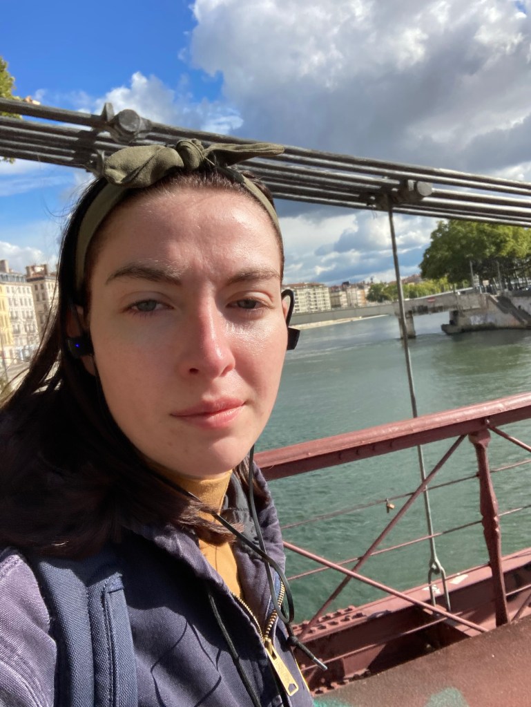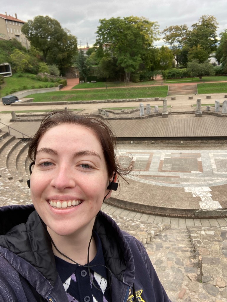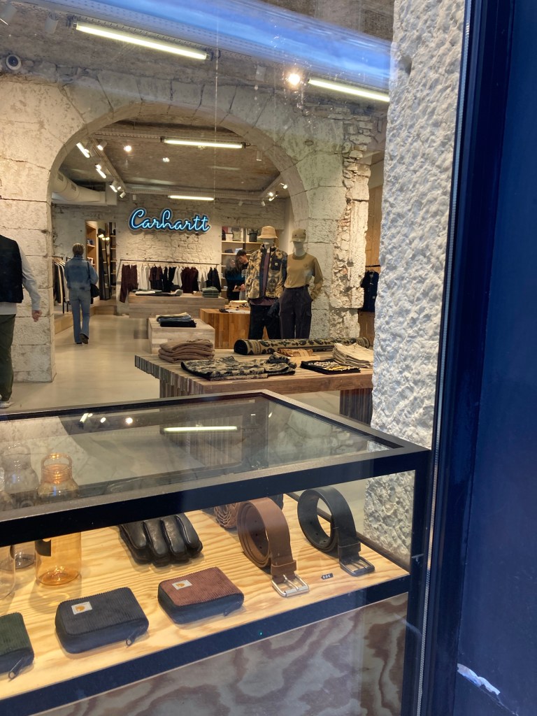 The Roman amphitheater of Lyon, at one point completely buried by pasture, dug out by the man after which my school is named.A little amuse-bouche at a museum. One of the main squares. Here is good food, an art museum, a government building, and a handy meeting place.The view from my apartment. You can see the biggest basilica in Lyon on top of the hill, next to a radio tower (not the Eiffel Tower!).A high-end Carhartt store. Prices are jacked way up. Presented and sold like it’s Louis Vuitton. Lyon has two rivers that make the city into a peninsula. This one, to the west, is the Saône. American-style sandwich. Four hamburgers, a sauce of your choice, and fries as the topping.The only Halloween gear I could find. Sad, really. I think the French would love Halloween.