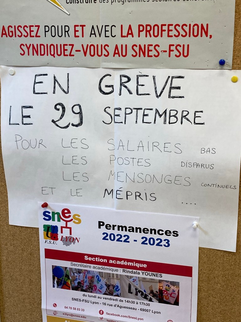 A poster for a general protest held in the main city square, posted in the teacher’s lounge of my school. “For low salaries, disappearing jobs, continued lies, and the disdain.” I can’t imagine something like this being allowed or left up in a school in the U.S.
