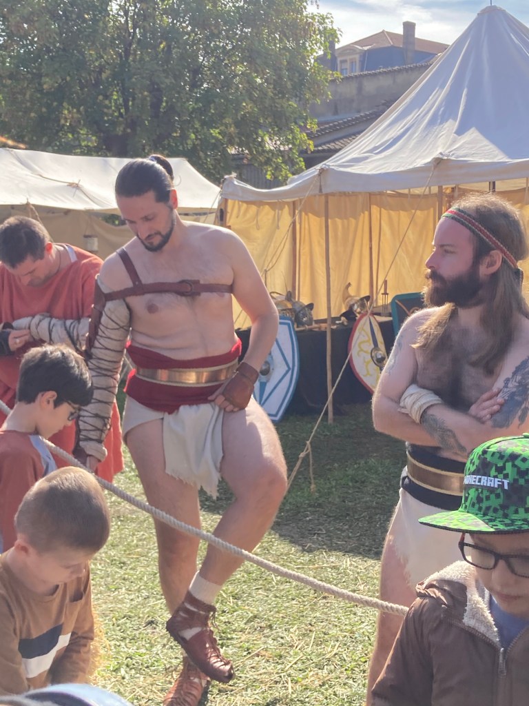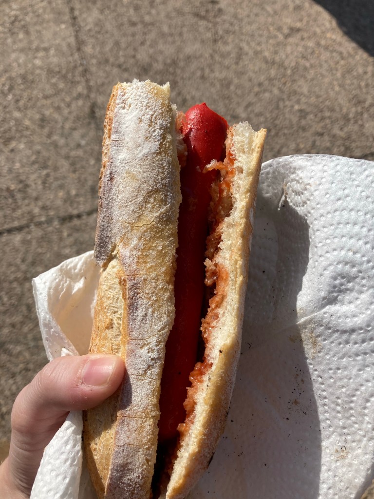 The French idea of a hot dog which I got at the Roman festival. Yes, that is a baguette. The “American” hot dog had fries as a topping.