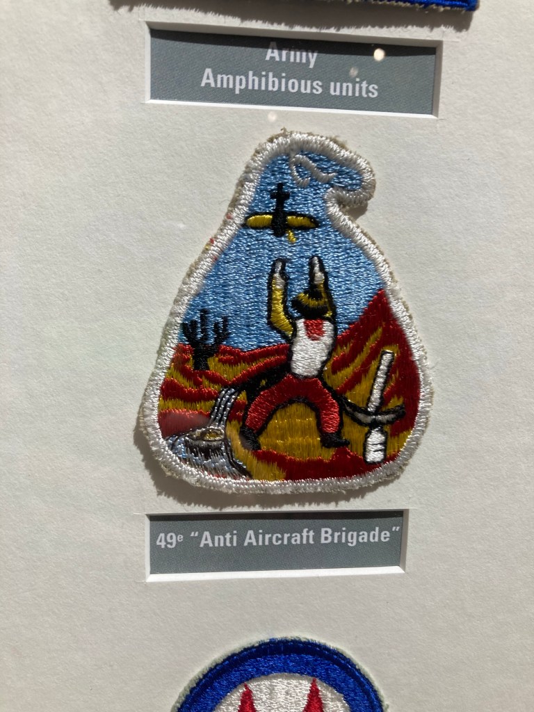 I went to a D-Day museum near Bayeux (pretty common around these parts). I thought this was pretty funny; a patch worn by the American anti-aircraft brigade during Operation Overlord, featuring a soldier throwing two middle fingers up at a plane. Gets the point across!
