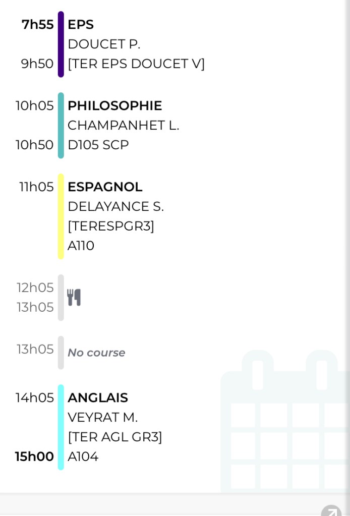 One last thing: everybody wants to know about a day in the life of a French teenager. One of my students was kind enough to send along her weekly schedule! Take a look.