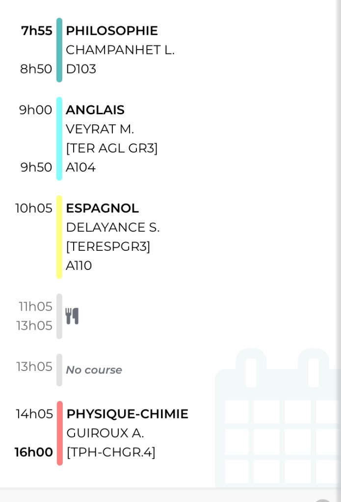 One last thing: everybody wants to know about a day in the life of a French teenager. One of my students was kind enough to send along her weekly schedule! Take a look.