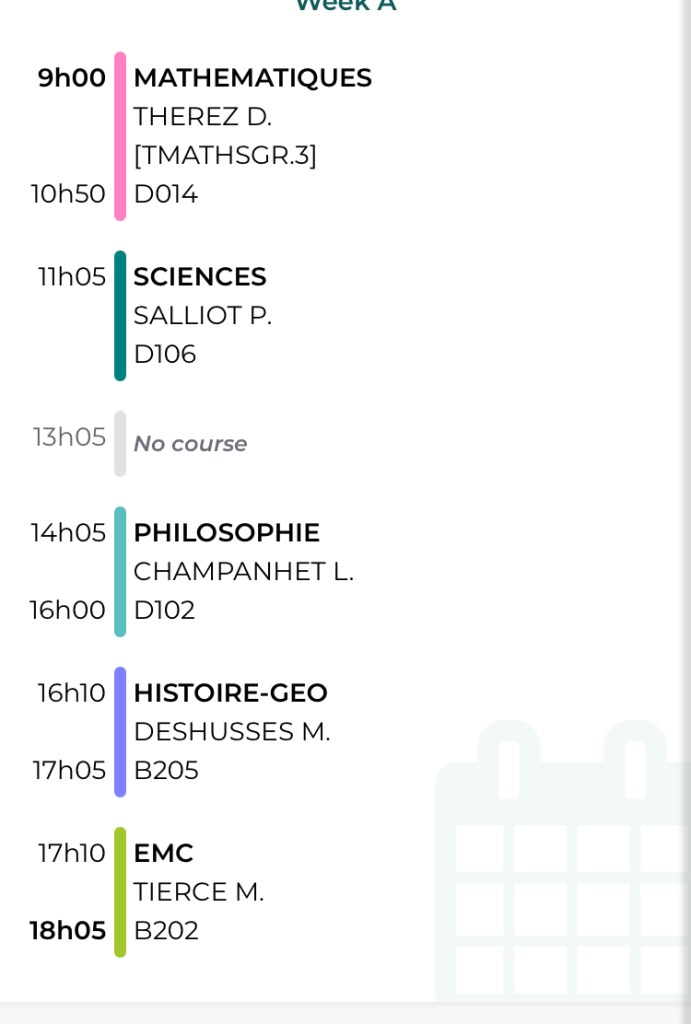 One last thing: everybody wants to know about a day in the life of a French teenager. One of my students was kind enough to send along her weekly schedule! Take a look.