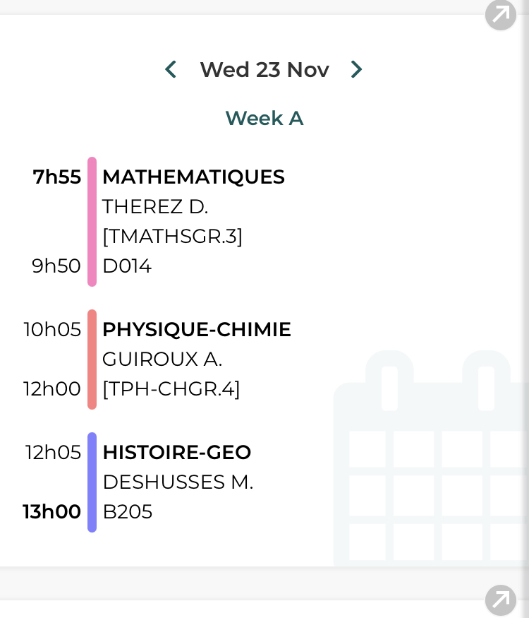 One last thing: everybody wants to know about a day in the life of a French teenager. One of my students was kind enough to send along her weekly schedule! Take a look.