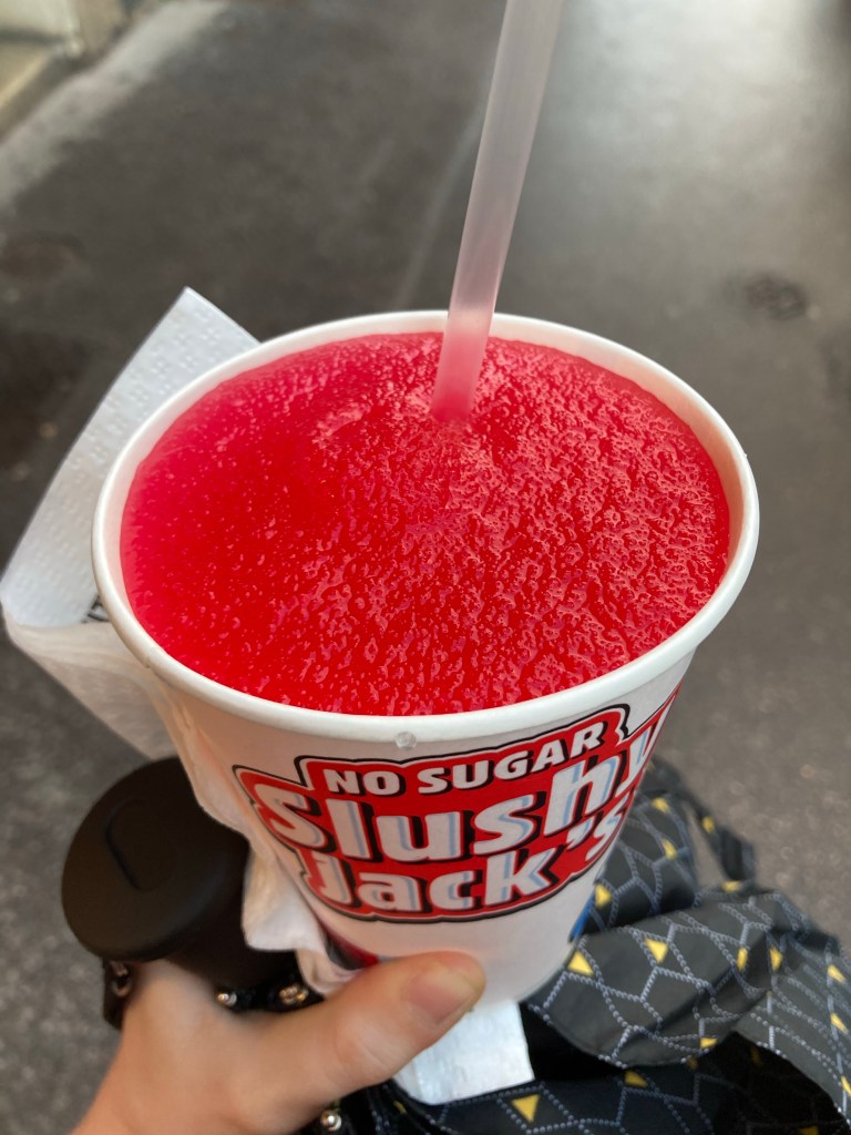 I noticed while I paid that a very familiar object sat behind the register. A slushie machine! Of course I got a cherry slushie, of course, of course. Oh man, that first sip had me feeling like I was standing in a Weigels parking lot. I was transported. It was a little too sweet, and tasted a little too much like actual cherries and not enough like corn syrup, but I was too jazzed about it to care.